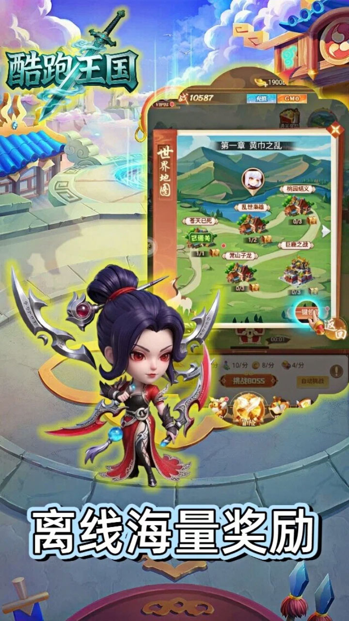《酷跑王国》是一款三国题材的休闲放置卡牌游戏,游戏以通关主线关卡为主要玩法。玩家在游戏中可以收集武将组建最强阵容挑战主线关卡。主线关卡会产出主公经验,并且玩家离线的时候挂机队伍也会不停的挑战主线关卡获取主公经验。主公升级后可以大幅提升队伍的实力。除了主线关卡外,还有玲珑宝塔和精英副本供玩家挑战,挑战玲珑宝塔可以获取武将穿戴的装备,挑战精英副本可以获取低品质武将。获取的低品质武将可以拿来合成高品质的武将。