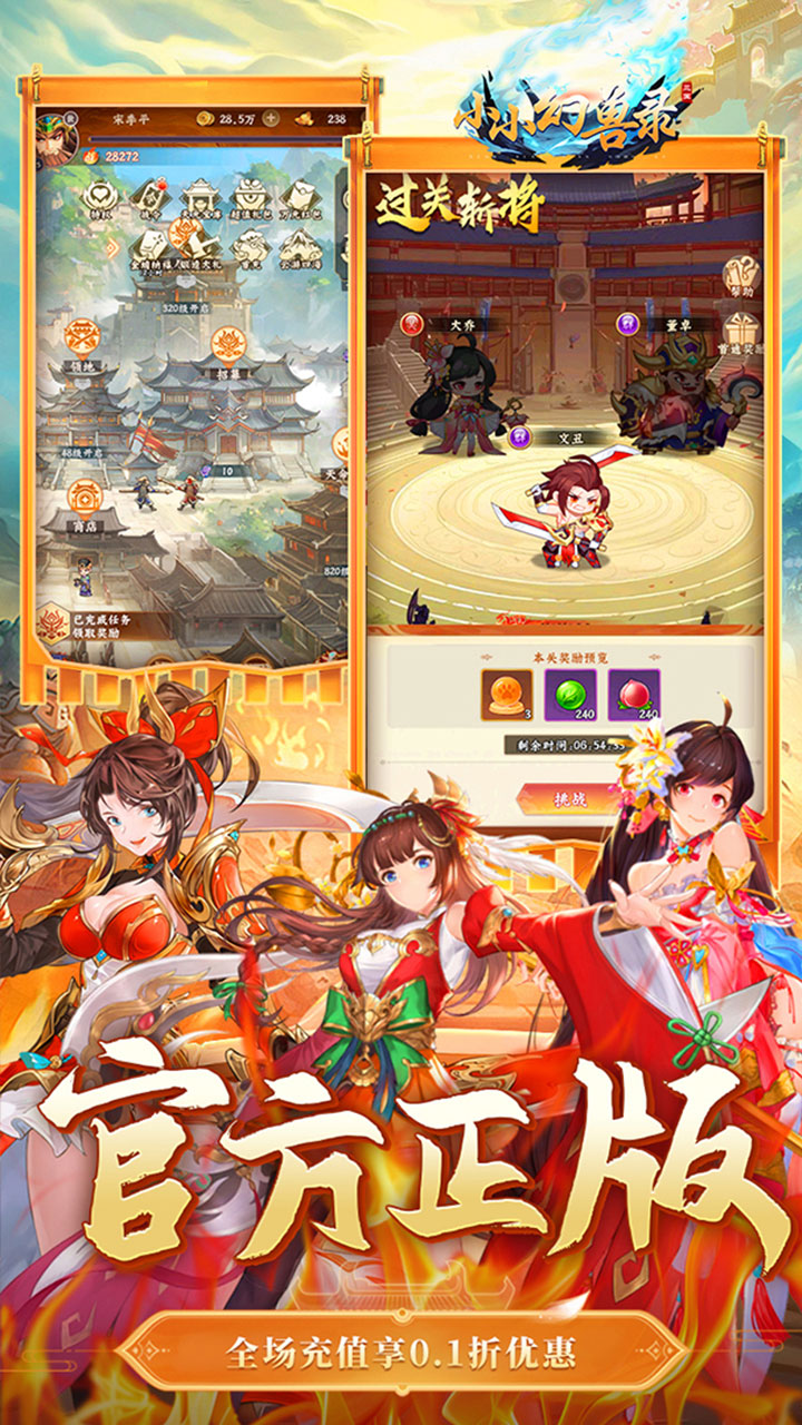 1.三国放置卡牌福利手游官服,首续充值均享0.1折!