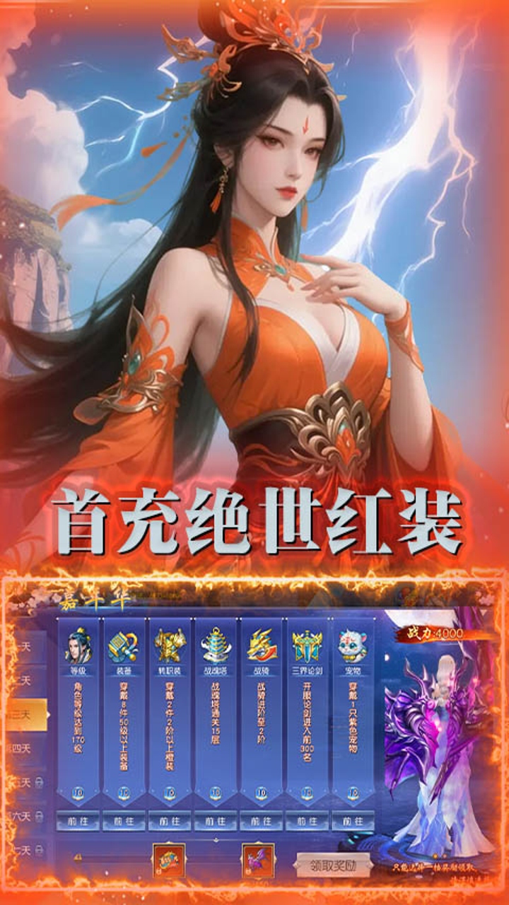 2、首充还有绝版坐骑,领取绝版红色武器!炫酷时装!炫酷羽翼让你战力飙升!