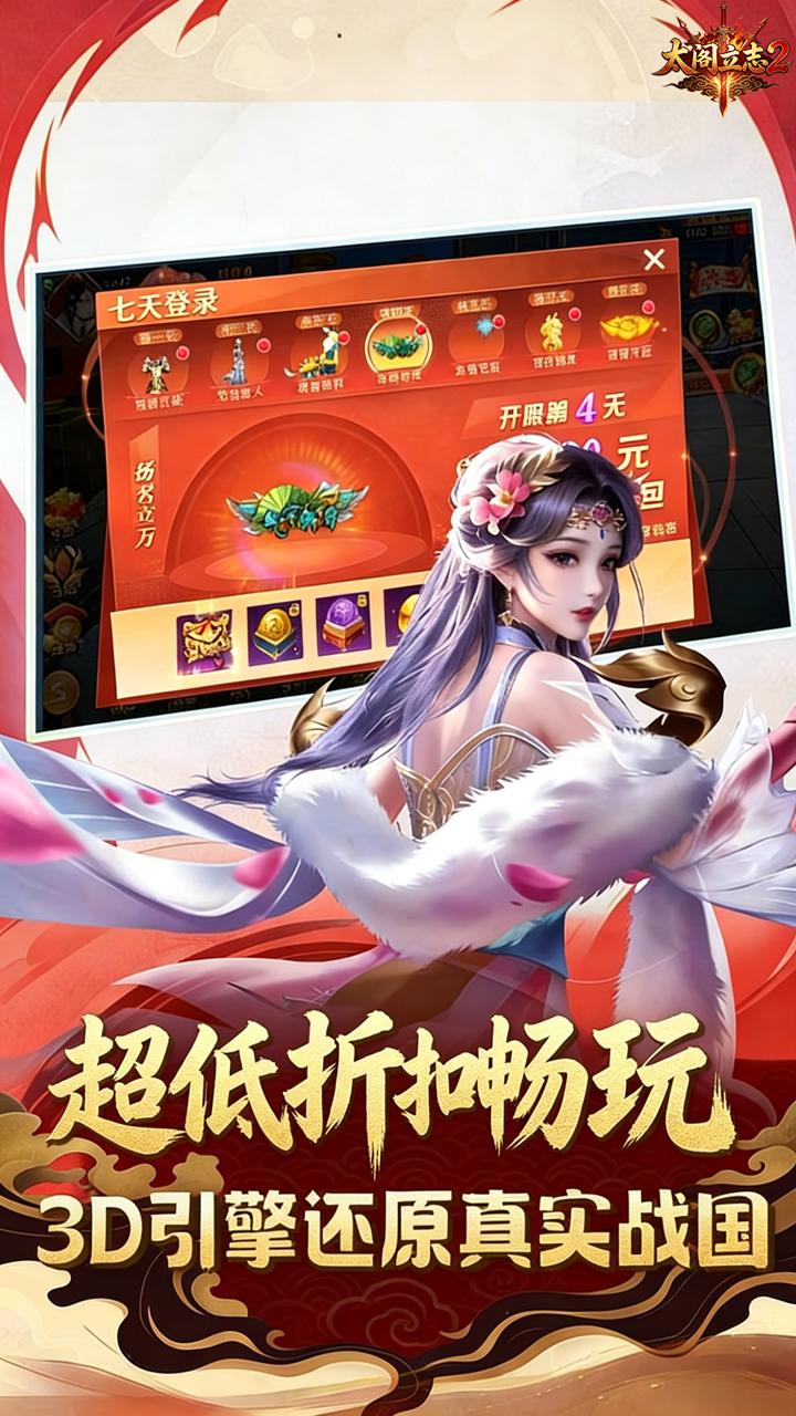 3:7天狂欢,豪华盛宴:连续7天登录,天天都有惊喜!极品红装、倾世美人、珍稀坐骑,元宝拿到手软