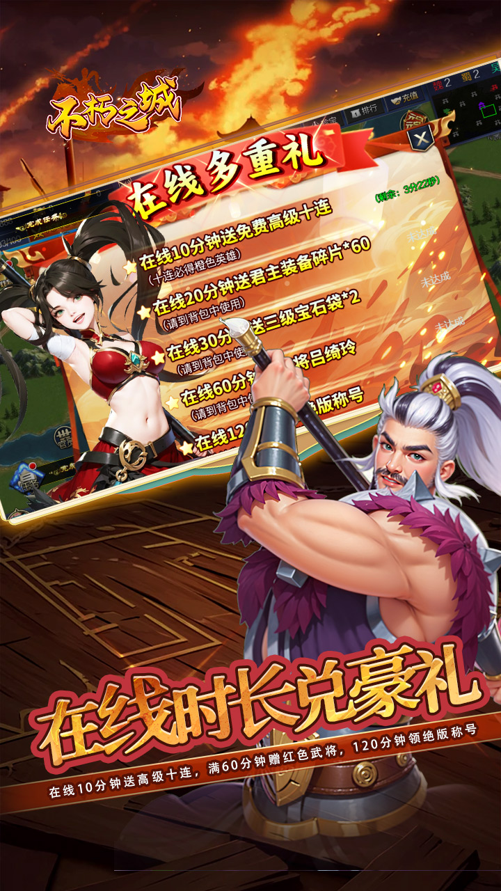 在线时长兑豪礼:在线10分钟送高级十连,满60分钟赠红色武将,120分钟领绝版称号