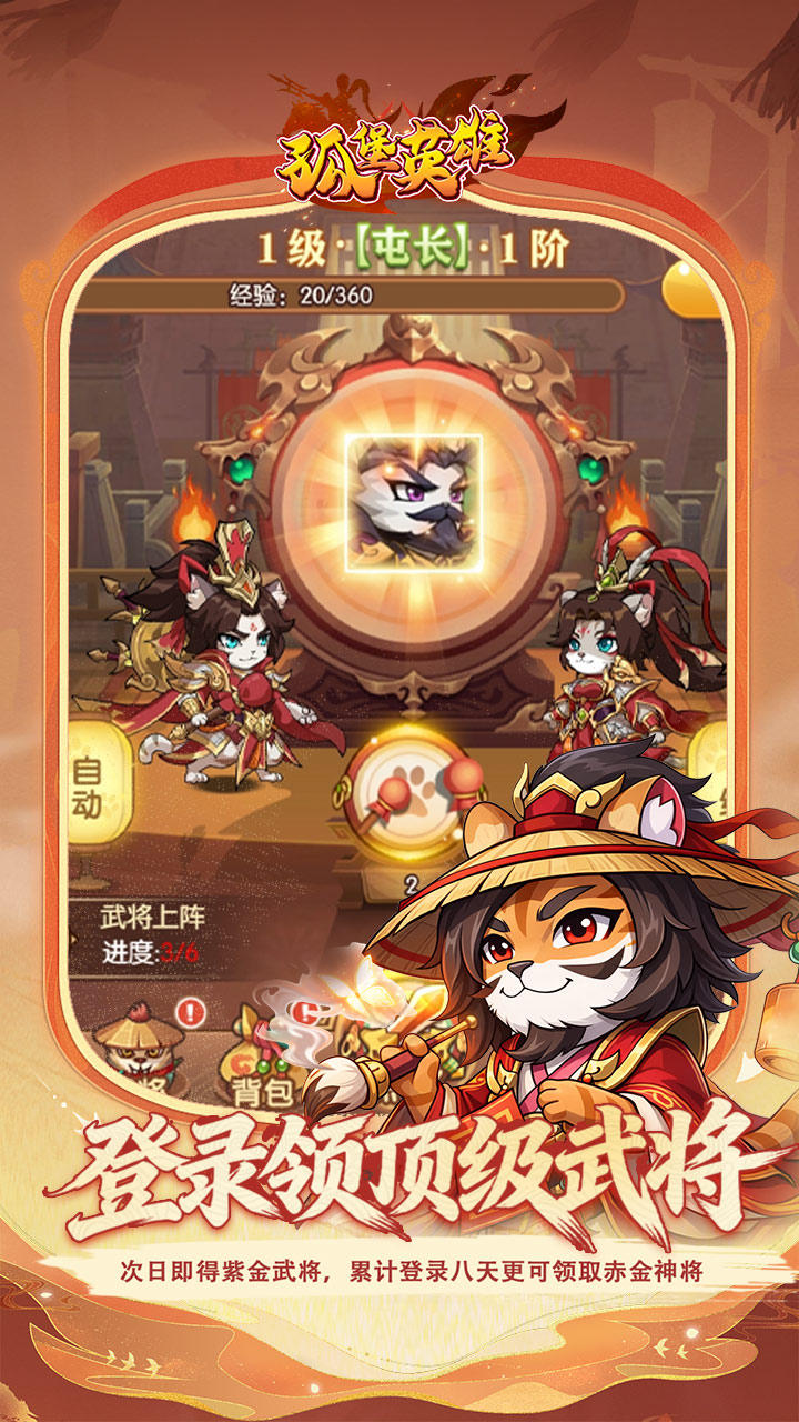 登录领顶级武将:次日即得紫金武将,累计登录八天更可领取赤金神将