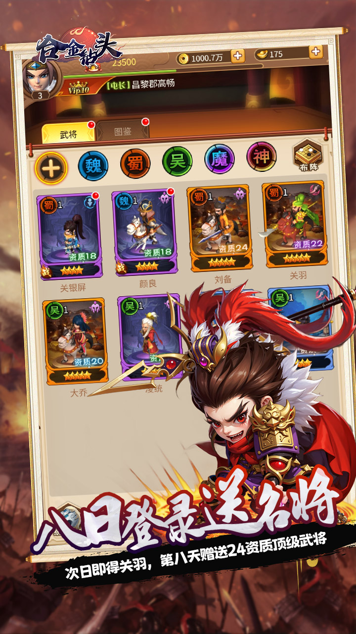 【八日登录送名将】次日即得关羽,第八天赠送24资质顶级武将